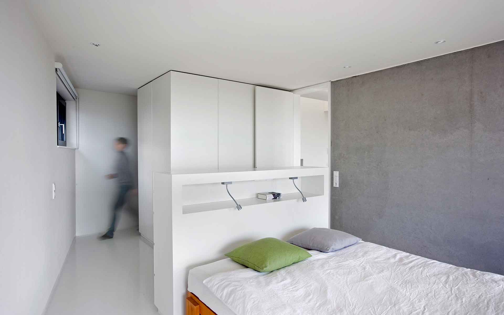 Wohnbereich und Loggia verbindet eine großflächige Verglasung, die die einzige Öffnung des Raumes in den Außenbereich darstellt. Da das Dach des Hauses entgegen dem Hangverlauf geneigt ist, steigt die Raumhöhe kontinuierlich bis auf 3,70 m an. Das gesamte Eingangsgeschoss öffnet sich somit allein dem Blick in die Rheinebene, der durch die Loggia zusätzlich gerahmt und fokussiert wird. Das verleiht dem kleinen Gebäude seine Großzügigkeit. Unterstützt wird der großzügige Eindruck durch die reduzierte Farb- und Materialwahl. Flächenfertige Materialien wie Sichtbeton und eine fugenlose weiße Bodenbeschichtung stehen im Kontext zu einfachen, weißen Wänden. Im Untergeschoss befinden sich die Rückzugsbereiche wie Schlaf- und Gastraum. Die Hanglage erlaubt auch bei diesen intimen Räumen eine uneinsehbare, bodentiefe Verglasung mit Blick ins Tal.